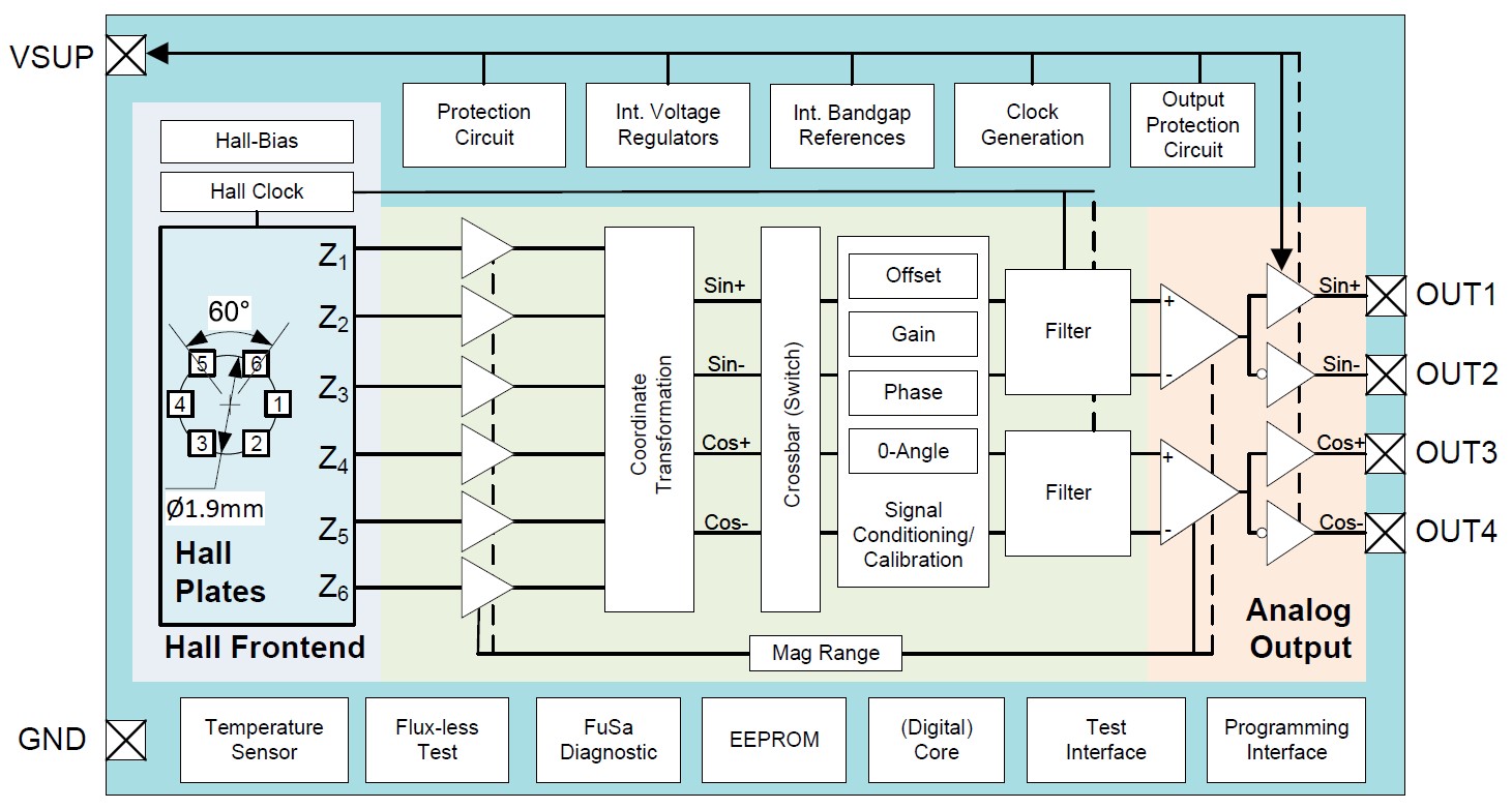 The family provides differential or single-ended sine and cosine analog outputs with integrated wire-break detection; the rotation angle of a magnet is calculated externally by an A/D converter and a microcontroller/ECU. An array of Hall plates suppresses external magnetic stray fields by design, so a simple two-pole magnet in an end-of-shaft configuration is sufficient to measure absolute angular position - the magnet may be placed above or below the sensor. The Hall-plate array measurement principle also minimizes errors due to supply voltage and temperature variations.